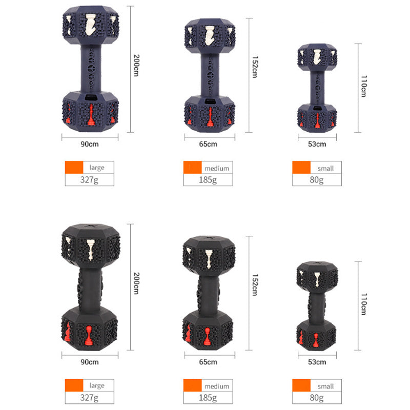 Unique dumbbell design: Both ends of dumbbell adopting 3D particles design,Hollow ends allow you to put treats like peanut butter, snacks into it to arounse dog's interests, besides, the dumbbell add with pineapple flavor,which is better to attract the attention of your dog
